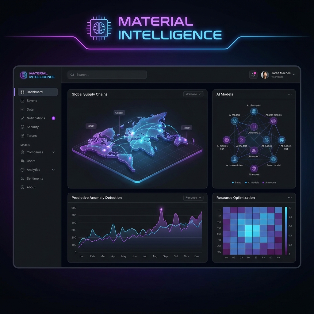 A futuristic AI-powered dashboard offering real-time insights, automated report summaries, and price forecasts for over 2,500+ industrial materials using Generative AI and machine learning.