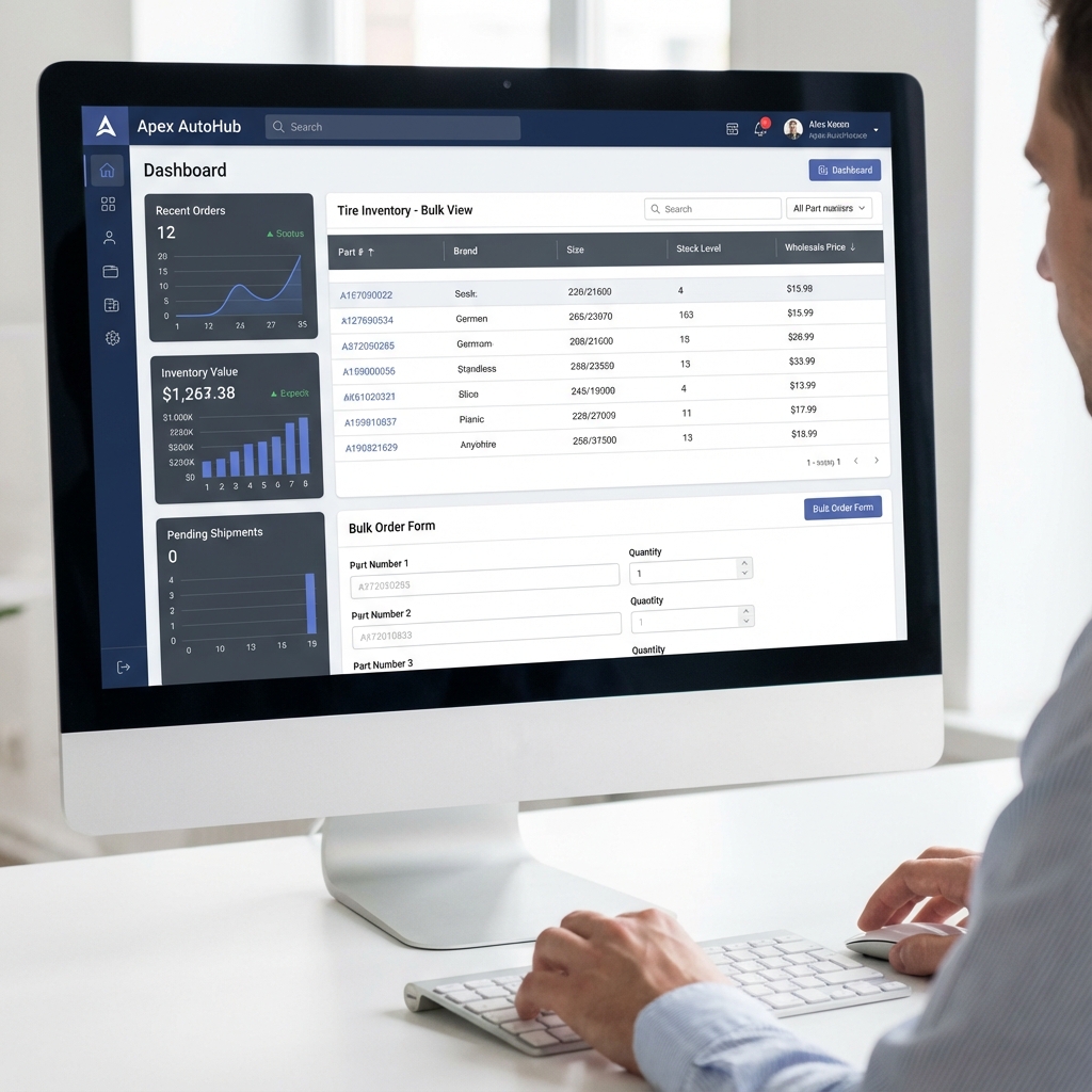 A dedicated B2B e-commerce platform for tire wholesalers, featuring bulk-order capabilities, tiered account pricing, and streamlined procurement tools for businesses.