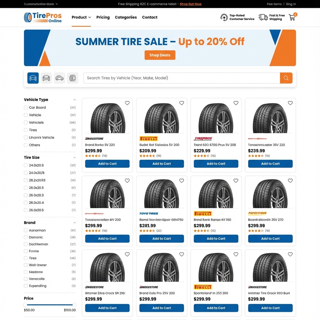 A customer-focused e-commerce solution for tire sales, offering real-time inventory, intuitive product filtering, and a seamless checkout experience optimized for all devices.